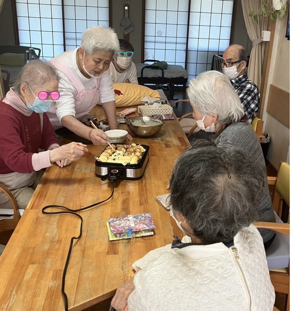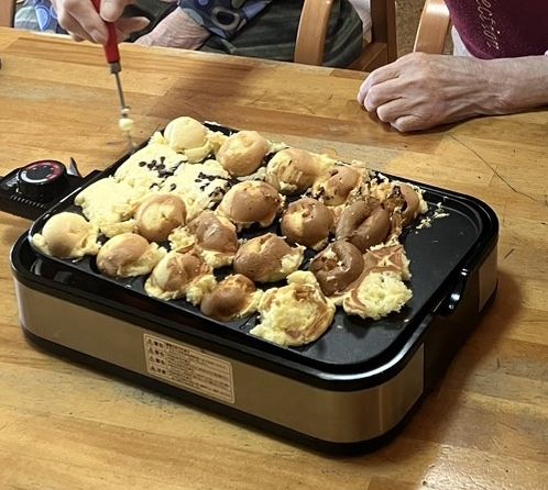 たこ焼き器を使って、くるくるくる・・・利用者さんも一緒に。