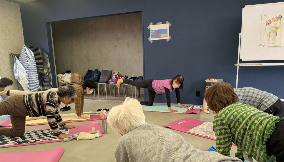 前屈したり、あおむけで手足をぶらぶらさせたり、よつんばいになって足を上げたり。